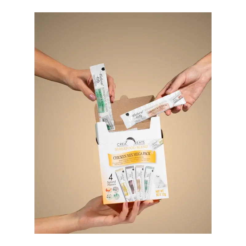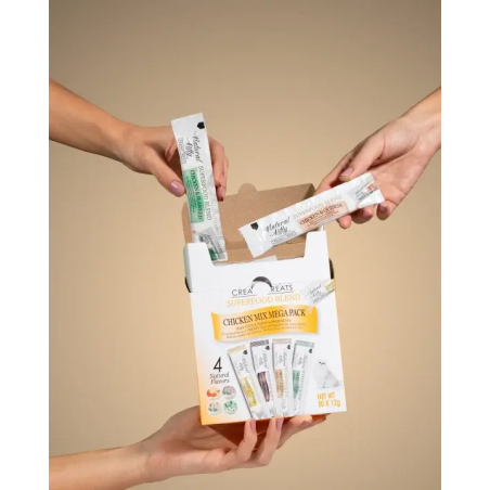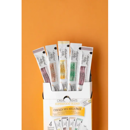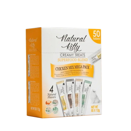 NATURAL KITTY SUPERFOOD BLEND CREAMY TREATS – CHICKEN MIX MEGA PACK powstaje w 100% z kurczaka, połączonych z superfoods, aby wzbogacić wartość odżywczą i smak, który koty uwielbiają. To najlepsza codzienna nagroda dla Twojego kota. Możesz podawać Natural Kitty każdego dnia jako nagrodę lub smakołyk, a także jako lekką przekąskę albo uzupełnienie głównego posiłku.