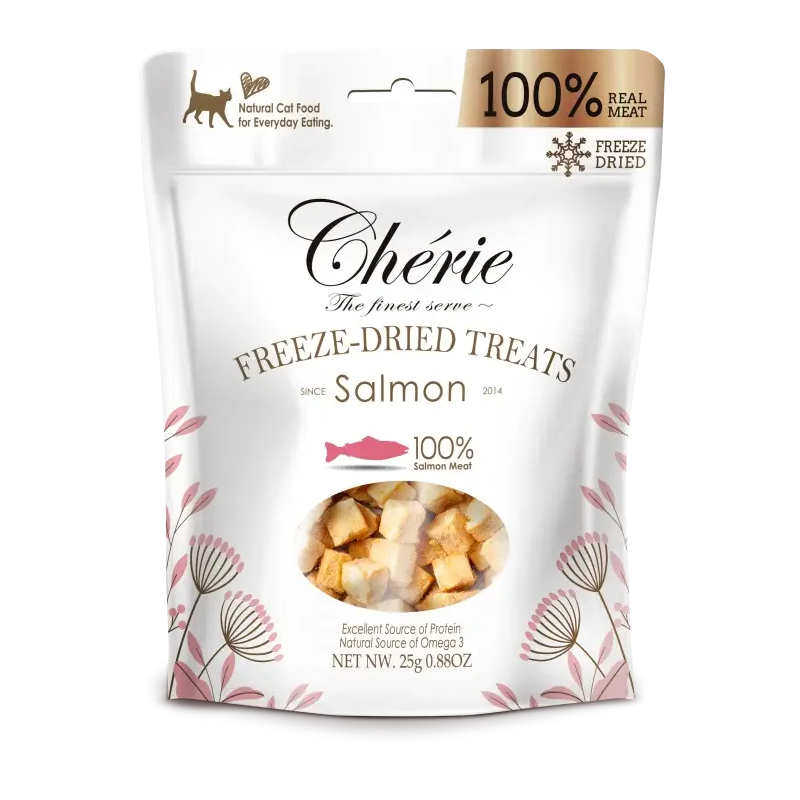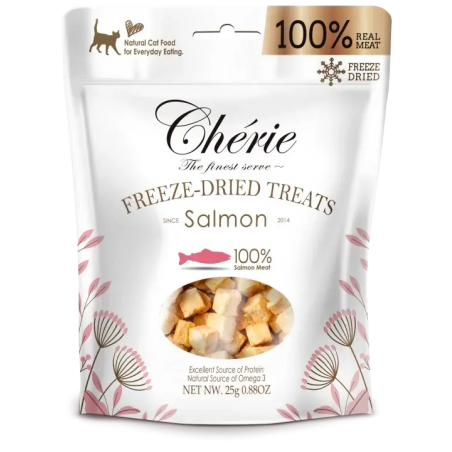 Liofilizowane kawałki 100% łososia od marki Pettric Cherie – absolutnie naturalny przysmak dla psów i kotów. Dzięki metodzie liofilizacji, czyli suszeniu przez zamrażanie i usuwaniu wilgoci, przysmak zachowuje pełnię smaku, aromatu i wartości odżywczych mięsa. Bez zbóż, glutenu, konserwantów i sztucznych dodatków – idealny jako nagroda treningowa, dodatek do posiłku lub przysmak do chrupania.