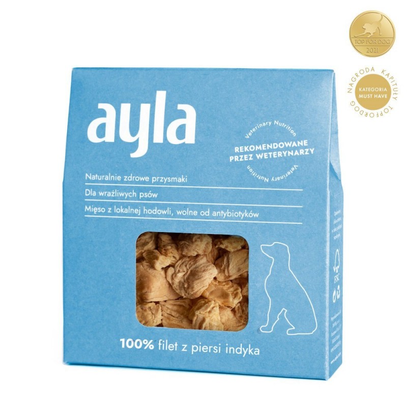 Liofilizowane przysmaki z filetu z piersi indyka to przysmaki idealne nawet dla najbardziej wyrafinowanych psich podniebień. Są niezwykle smaczne i lekkostrawne. Naturalne i zdrowe przysmaki AYLA wyprodukowane są w 100% z mięsa najwyższej klasy A, pochodzącego z lokalnej hodowli i wolnego od antybiotyków.