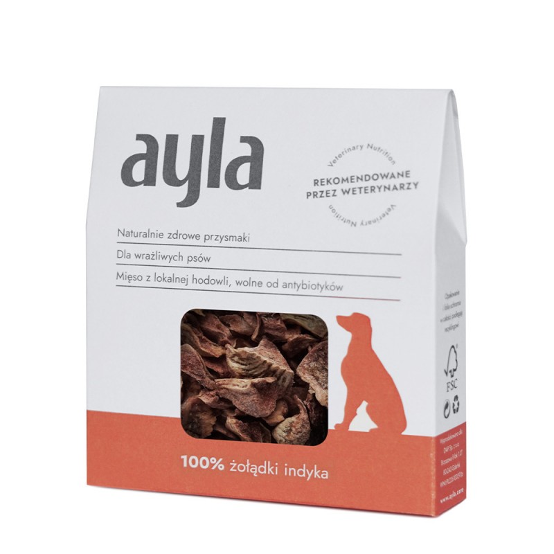 Przysmaki AYLA są monobiałkowe, nie zawierają żadnych sztucznych dodatków, konserwantów czy zbóż i innych wypełniaczy. Polecane są zarówno dla psów dorosłych jak i szczeniąt. Lekarze weterynarii rekomendują przysmaki AYLA zarówno dla zdrowych psów, jak i psów wrażliwych, z problemami zdrowotnymi jak alergia czy choroby układu pokarmowego.
