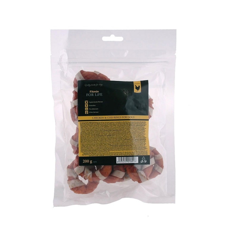 Pyszny, naturalny przysmak dla psów wszystkich ras, w formie krążków, z dorsza i kurczaka.