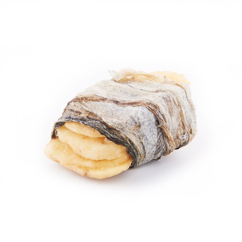 Naturalny przysmak dla psa, sporządzony z suszonych plastrów banana owiniętych w delikatną rybią skórę. Bogate w kwasy Omega-3.
