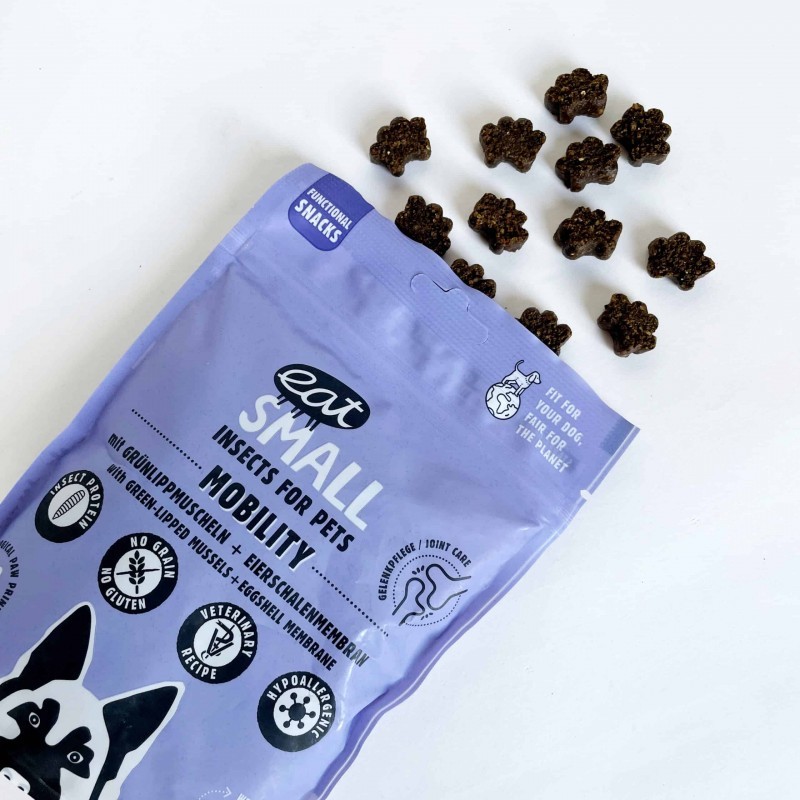 Eat Small Iscect Mobility to rewolucyjne, zdrowe przysmaki, idealne do nagradzania w treningu, odpowiednie dla psów wszystkich ras, w każdym wieku, w tym także psów wrażliwych, cierpiących na nietolerancje i alergie pokarmowe. Przysmaki w swoim składzie posiadają białka owadów, które są obecnie jednym najbardziej odżywczych i przyjaznych dla środowiska źródeł białka. Insekty hodowane są w certyfikowanych gospodarstwach, spełniających ścisłe europejskie normy produkcji i higieny żywności pochodzenia zwierzęcego.