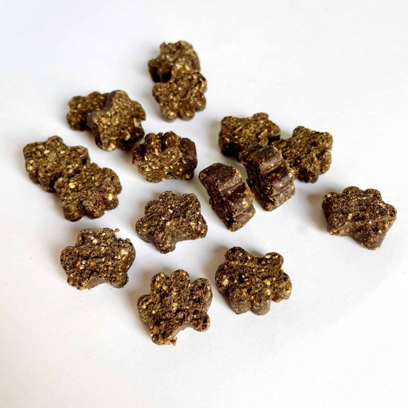 Skład: Kasztany jadalne 30%, Hermetia illucens 23,5% (larwy 22% i olej 1,5%), gliceryna roślinna, skrobia ziemniaczana, mielone nasiona konopi 7%, drożdże piwne, omułki zielonowargowe 1%, błona skorupki jaja 0,5%. .