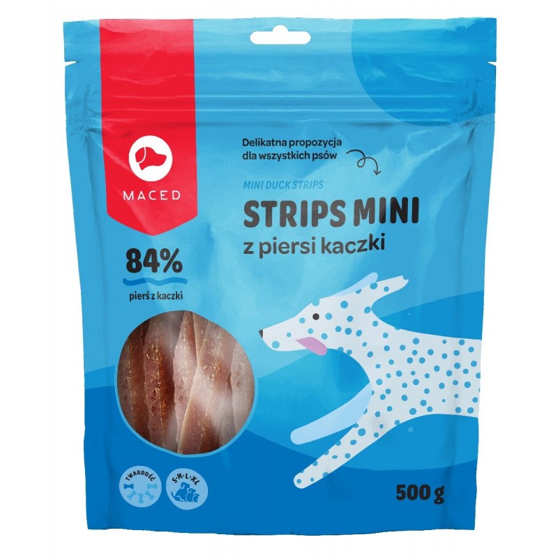 Maced miękkie paski z kaczki MINI to smaczna przekąska dla psów. Ze względu na swój rozmiar i odpowiednią miękkość przeznaczona jest dla psów mniejszych ras, w każdym wieku. W związku z niską zawartością tłuszczu przysmak będzie odpowiedni dla małych łakomczuchów z tendencją do tycia.