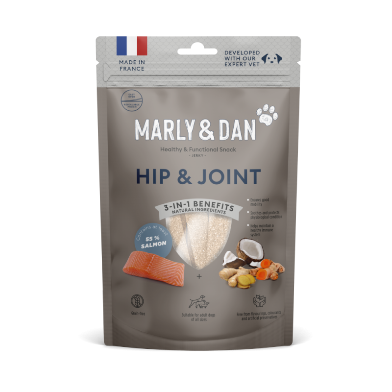 Przysmaki Marly & Dan Jerky Hip & Joint zostały opracowane w celu wspomagania prawidłowego funkcjonowania stawów poprzez wykorzystanie zalet składników naturalnego pochodzenia dla wsparcia dobrej chrząstki (mączki z kości rybnych). Imbir i cynamon to naturalne składniki wspierające rozluźnienie mięśni psa. W swoim składzie zawierają co najmniej 50% łososia, brak w nich sztucznych konserwantów, aromatów, barwników czy cukru.