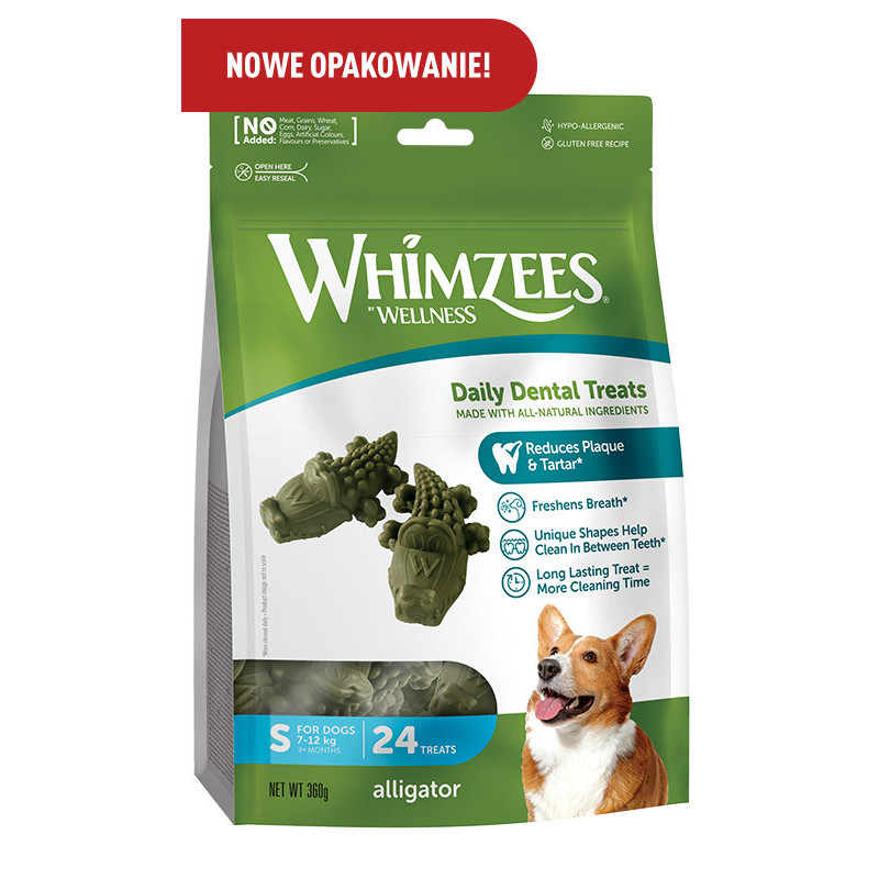 Higiena jamy ustnej u psów jest tak samo ważna, jak u ludzi, a gryzaki dentystyczne Whimzees ułatwiają psom codzienne oczyszczanie zębów. Aligator Whimzees, to gryzaki dentystyczne dedykowane dla psów wszystkich ras. Są wegetariańskie i w pełni naturalne, całkowicie jadalne i łatwo przyswajalne. Pomagają odświeżyć oddech i zmniejszyć osad gromadzący się na zębach Twojego psa. Nie zawierają glutenu, dlatego są świetnym rozwiązaniem dla psów wrażliwych.