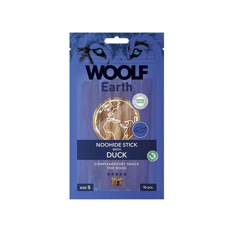 Woolf Earth Noohide Stick with Duck to naturalne gryzaki z mięsem kaczki, które pomagają w prawidłowej pielęgnacji zębów i zaspokajają potrzebę żucia i gryzienia. Gryzaki Woolf Earth nie zawierają żadnych dodatków aromatyzujących, substancji konserwujących, barwników chemicznych, cukru, soli są w 100% naturalne.