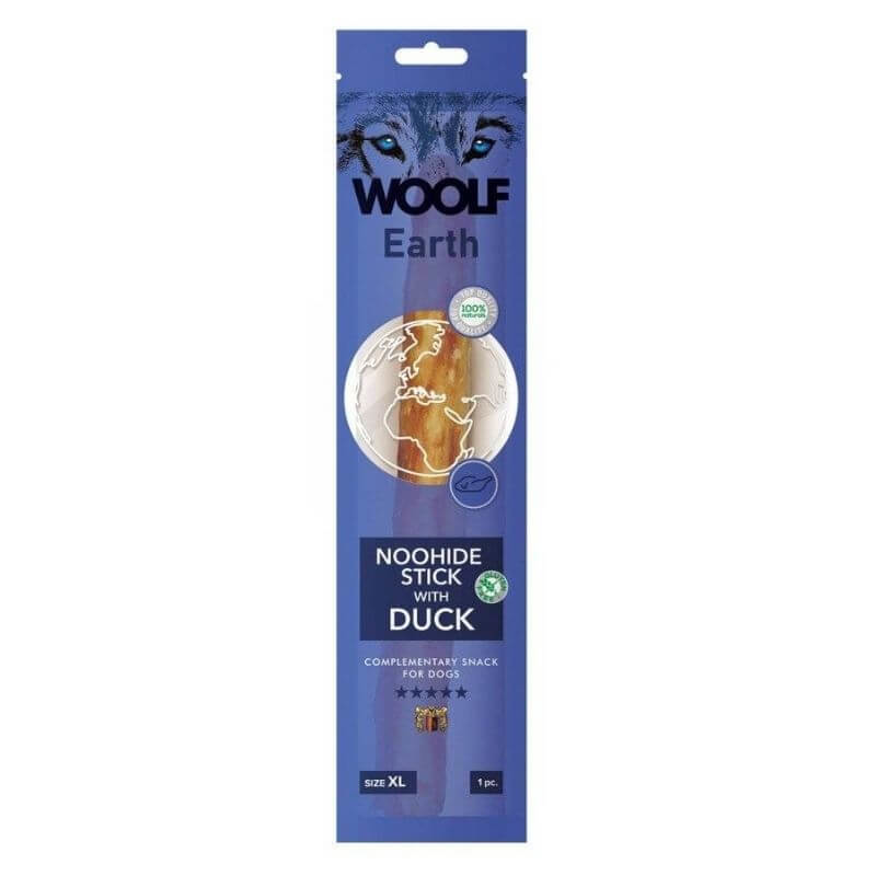Woolf Earth Noohide Stick with Duck to naturalne gryzaki z mięsem kaczki, które pomagają w prawidłowej pielęgnacji zębów i zaspokajają potrzebę żucia i gryzienia. Gryzaki Woolf Earth nie zawierają żadnych dodatków aromatyzujących, substancji konserwujących, barwników chemicznych, cukru, soli są w 100% naturalne.