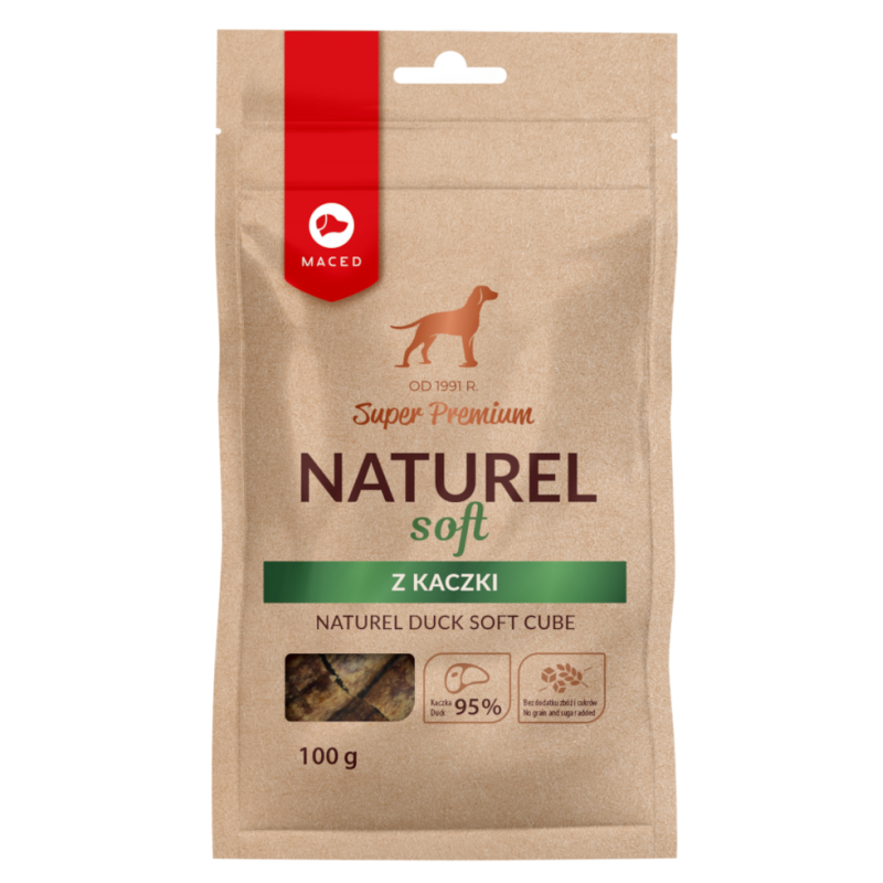 Maced Naturel Soft to naturalne monoproteinowe przysmaki mięsne z kaczki. Przysmak Naturel Soft to produkt, zawierający aż 90,5% mięsa z kaczki, które jest jedynym źródłem białka. Kaczka jest doskonałym źródłem żelaza, cynku oraz witamin z grupy B. Te lekkostrawne kąski świetnie nadają się dla psów powyżej 3 miesiąca życia.