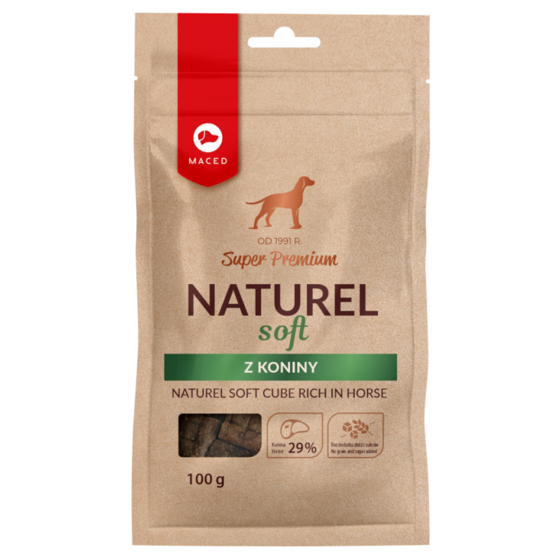 Maced Naturel Soft to naturalne monoproteinowe przysmaki mięsne z koniny. Przysmak Naturel Soft to produkt, zawierający aż 29% koniny, które jest jedynym źródłem białka. Konina jest doskonałym źródłem żelaza. Te kąski świetnie nadają się dla psów powyżej 3 miesiąca życia.