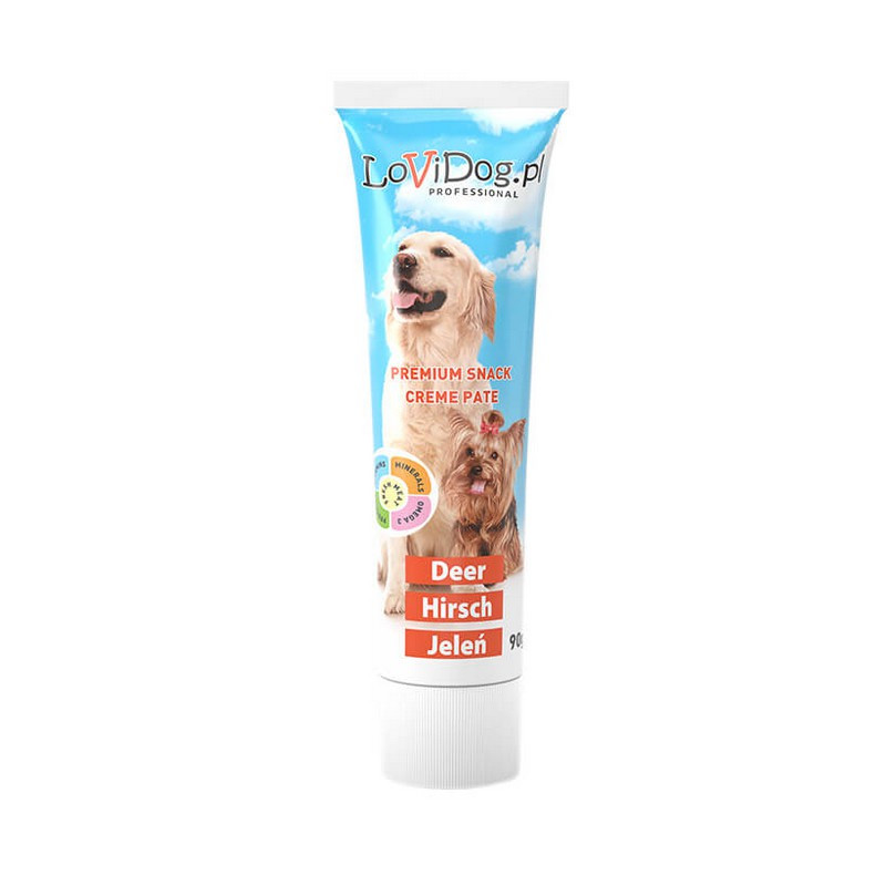 LOVIDOG Snack Creme Pate Deer to smakowity pasztet z jelenia, kwasami Omega-3 i witaminami oraz o wyjątkowym aromacie. Wylizywanie pasztetu to dla psa świetne, relaksujące zajęcie. Intensywny, mięsny aromat smakołyku bardzo ułatwia aplikację medykamentów.