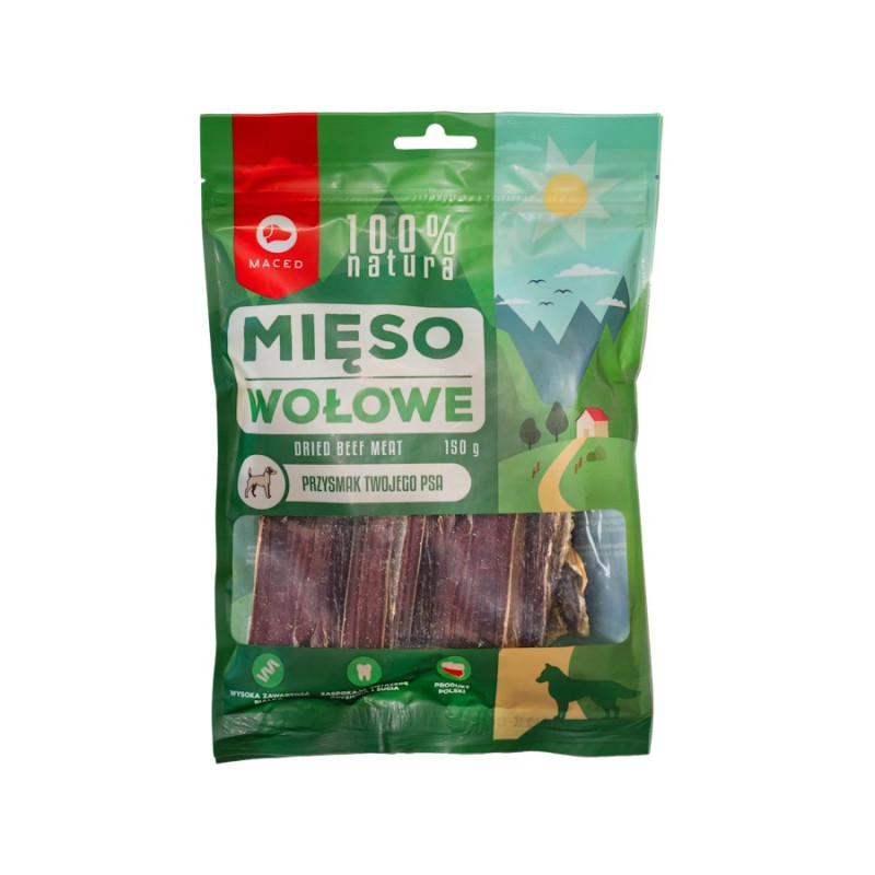 Maced Suszone mięso wołowe to w 100% naturalny smakołyk. Jego tekstura oraz naturalny, mięsny zapach, sprawia, że żaden pies mu się nie oprze. Kawałki są bogate w białko, proteiny oraz składniki mineralne, są więc idealną nagrodą dla psa i uzupełnieniem jego codziennej diety.