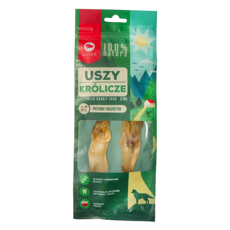 Suszone uszy królicze firmy Maced są w 100% naturalną przekąską dla Twojego psa. Nie zawierają sztucznych aromatów, konserwantów i barwników, a mięsny, naturalny zapach zachęca psa do żucia i gryzienia. Przysmak jest niskotłuszczowy i niskokaloryczny. Pielęgnuje zęby redukując osad i zapobiegając osadzaniu się kamienia nazębnego, ponadto gwarantuje długotrwałą radość żucia.