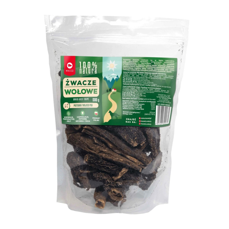 Maced Żwacze wołowe to w 100% naturalny smakołyk, poddane procesowi suszenia, dzięki któremu zachowują jak najwięcej walorów smakowych i wartości odżywczych świeżego produktu. Wyprodukowane z zachowaniem najwyższych standardów, z surowców pochodzących z certyfikowanych europejskich ubojni. Nie zawierają żadnych dodatków, barwików i konserwantów. Odpowiednia dla psów w każdym wieku. Podając go żywemu i energicznemu szczeniakowi, zapewnisz mu zajęcie na długi czas i i odciągniesz go o niszczenia przedmiotów w otoczenia, np. podgryzania mebli czy butów.