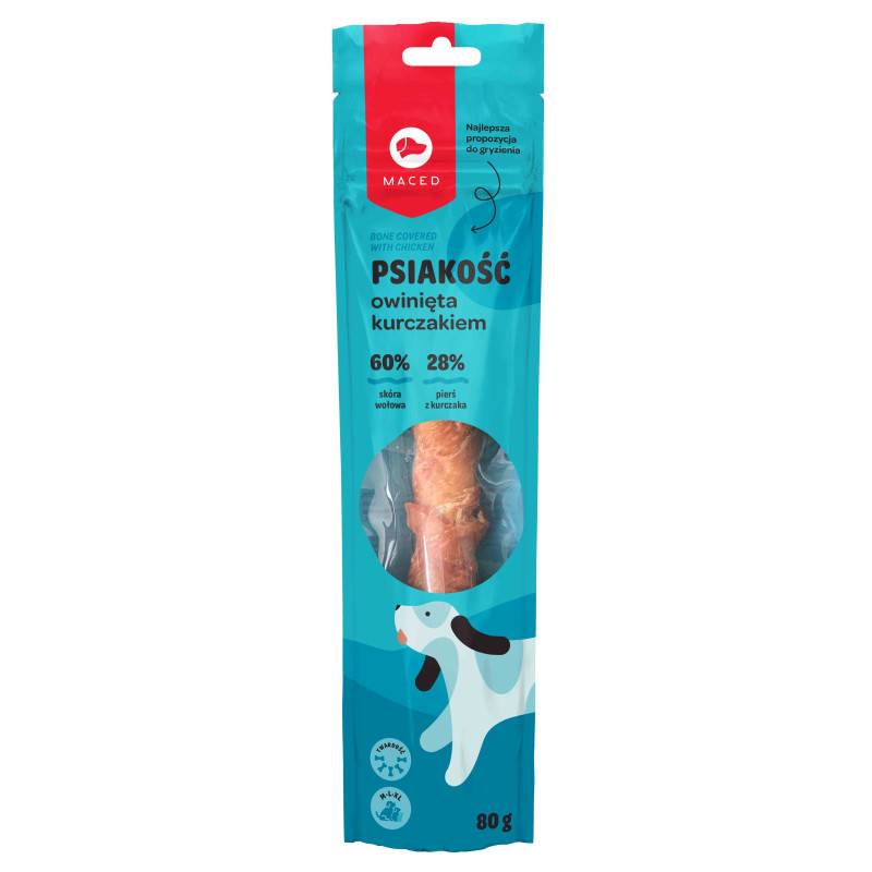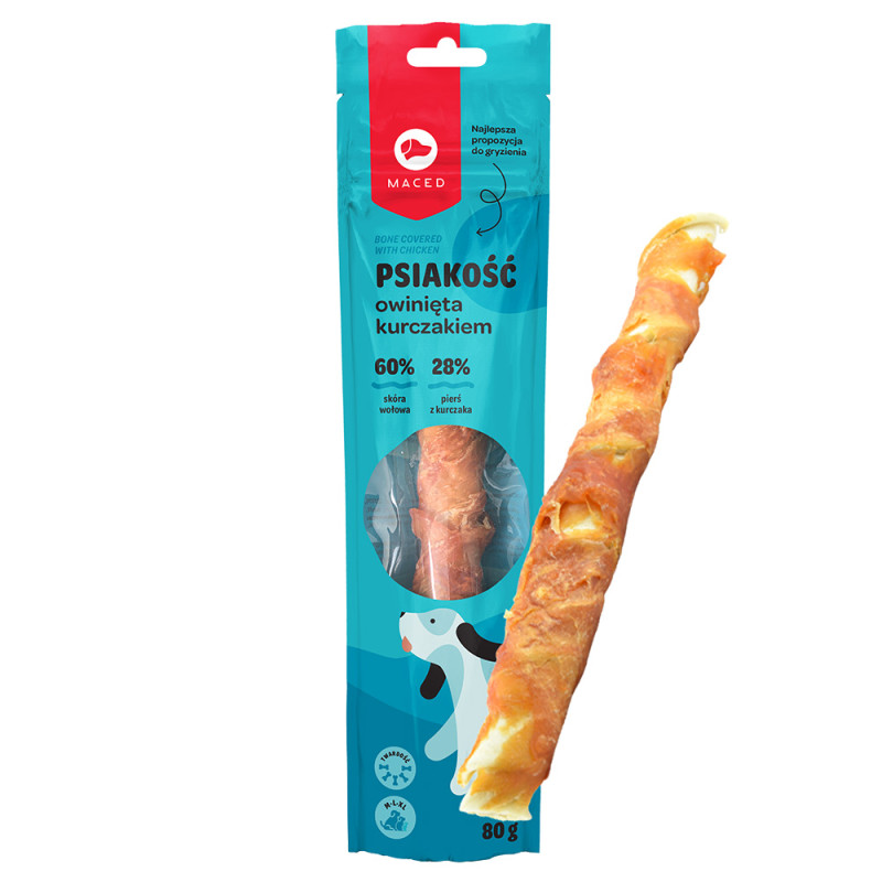 Psiakość pałka owinięta kaczką to gryzak ze skóry wołowej owinięty mięsem z kurczaka. Wykonana z twardej skóry wołowej pałka to smakowita przekąska dodatkowo czyszcząca zęby i wzmacniająca dziąsła psa.