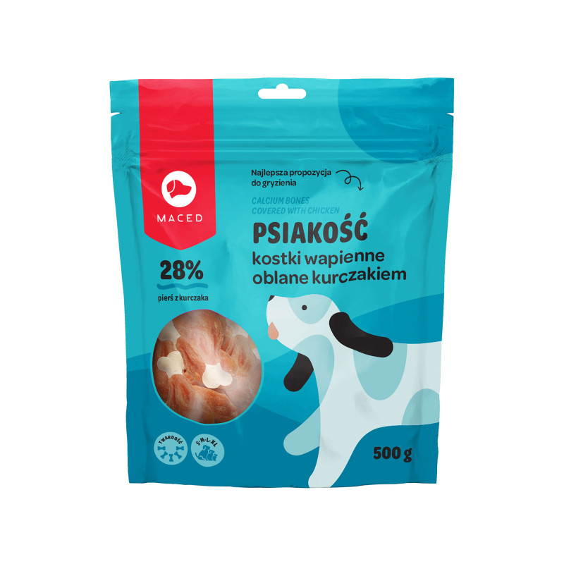Psiakość kostki wapienne oblane kurczakiem to smaczne wapniowe kosteczki dla psów, oblane suszonym mięsem z piersi kurczaka. Przekąska zaspokaja naturalną potrzebę gryzienia i żucia, dodatkowo pomaga dbać o higienę jamy ustnej. Przysmak idealnie sprawdzi się jako przekąska w trakcie spacerów, bądź nagroda podczas treningów. Karma uzupełniająca dla psów.