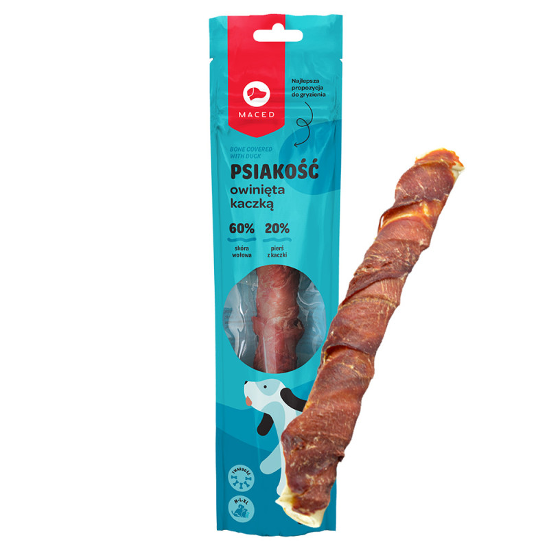 Psiakość pałka owinięta kaczką to gryzak ze skóry wołowej owinięty mięsem z kaczki. Wykonana z twardej skóry wołowej pałka to smakowita przekąska dodatkowo czyszcząca zęby i wzmacniająca dziąsła psa.