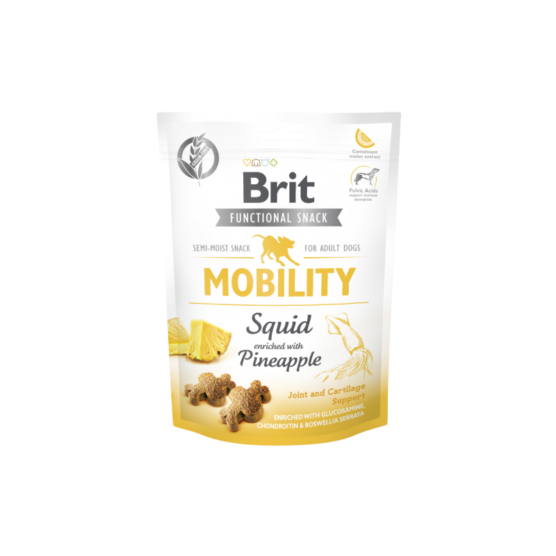 Przysmak dla psa Brit Care Functional Snack Mobility Squid to apetyczny przysmak dla psa wzbogacony o składniki, które wspierają prawidłowe funkcjonowanie stawów i proces rekonwalescencji w przypadku schorzeń. Dodatek chondroityny i glukozaminy wspiera właściwą budowę chrząstki stawowe, a naturalny ekstrakt roślinny (Boswellia serrata) jest wsparciem przy terapii stawów. Apetyczny przysmak w formie wygodnych do podania snaków został przygotowany na bazie kalmarów i słodkiego ananasa.