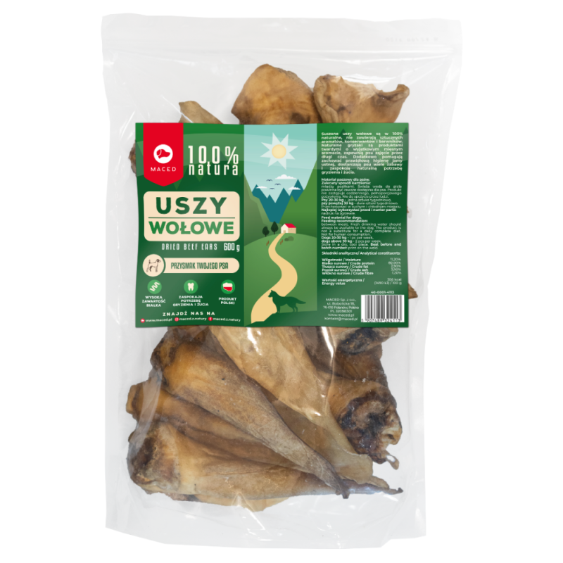 Ucho wołowe to naturalny przysmak dla psów, nie zawierających konserwantów. Dbanie o higienę jamy ustnej swojego psa jest bardzo ważne. Gryzienie i żucie suszonych uszu wołowych przyczynia się do mechanicznego czyszczenia zębów, pomagając w usuwaniu kamienia nazębnego i płytki bakteryjnej, co jest kluczowe dla zdrowia zębów i dziąseł. Oprócz wszelkich środków czyszczących zęby dostępnych na rynku, niewielu właścicieli wie, że dbać o zdrowie jamy ustnej można również za pomocą naturalnych przysmaków - w szczególności tych twardych.