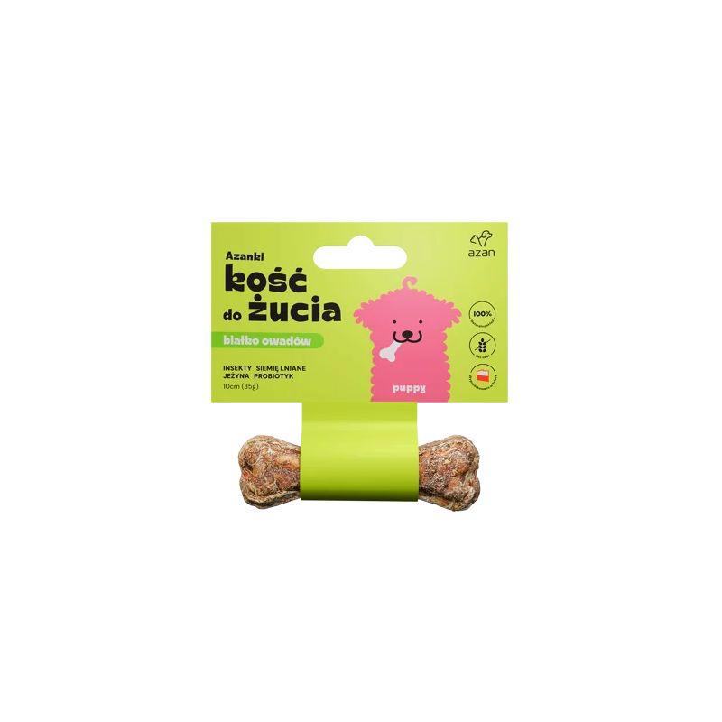 Azanki Kość do żucia Puppy z insektami, siemieniem lnianym, jeżyną i probiotykiem to wyśmienity przysmak dla szczeniąt, zaspokajający ich naturalną potrzebę gryzienia i żucia, która jest szczególnie nasilona w okresie wymiany zębów. Kości nie zawierają ostrych i kruchych elementów, stanowiąc bezpieczniejszą alternatywę dla rozmaitych gryzaków.