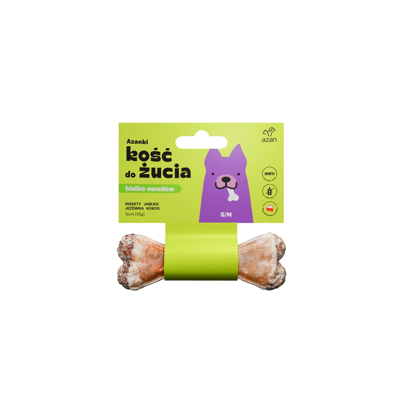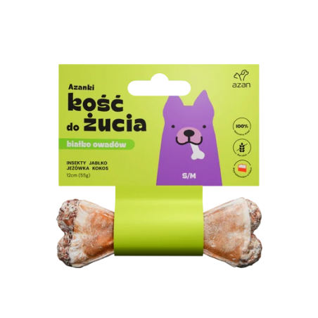 Azanki Kość do żucia S/M z insektami, jabłkiem, jeżówką i kokosem to wyśmienity przysmak dla dorosłych psów małych i średnich ras, zaspokajający ich naturalną potrzebę gryzienia i żucia. Kości nie zawierają ostrych i kruchych elementów, stanowiąc bezpieczniejszą alternatywę dla rozmaitych gryzaków.