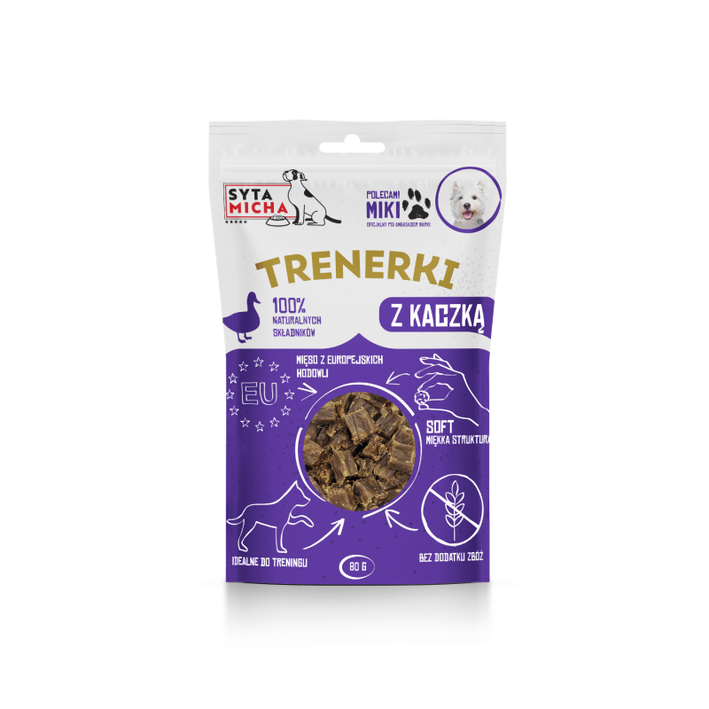 Smaczki z kaczką od Sytej Michy to małe, miękkie kawałeczki zamknięte w szczelnym opakowaniu, dzięki czemu nawet po otwarciu zachowują swoją świeżość i konsystencję.