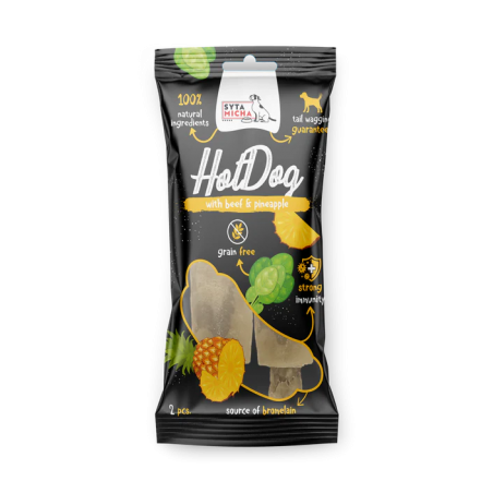 Spróbuj naszego nowego produktu, jakim jest przekąska Hot Dog z Wołowiną i Ananasem Syta Micha. To niezwykły smakołyk, który zachwyci nawet najbardziej wymagającego psiego smakosza.