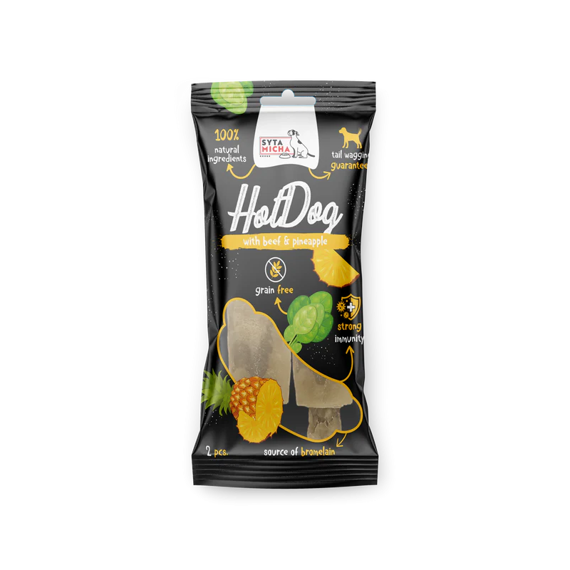 Dzięki unikalnej recepturze Hot Dog z Wołowiną i Ananasem Syta Micha stanie się ulubionym przysmakiem Twojego psa, który nie tylko zaspokoi jego apetyt, ale także zapewni mu niezbędne składniki odżywcze. Dzięki temu uzupełnisz jego dietę o zbilansowane składniki odżywcze. Każdy kolejny trening będzie przebiegał po twojej myśli, bo ten przysmak sprawi, że pies chętnie wykona każdą komendę.