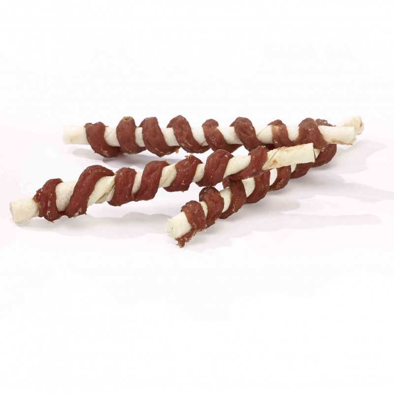 Skład: Skóra wołowa 45%, jagnięcina 30%, pierś z kaczki 8%, glicerol, białko orzechowe, tapioka, sorbitol, skrobia ziemniaczana, sól. Dodatki: konserwant.