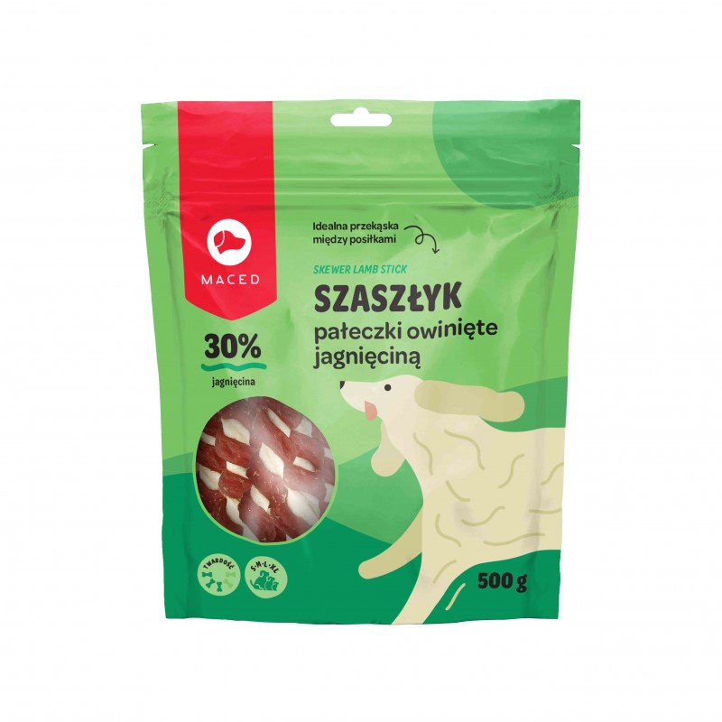 Szaszłyk pałeczki owinięte jagnięciną to smakowita przekąska w postaci pałeczki ze skóry wołowej owiniętej mięsem jagnięcym. Jest to bogaty w proteiny smakołyk dla Twojego psa. Przysmak zaspokoi potrzebę żucia oraz zadba o prawidłową higienę jamy ustnej. Doskonały smak, odpowiednia konsystencja oraz zapach gwarantują psu radość z jedzenia. Szaszłyk jest idealną przekąską pomiędzy posiłkami, sprawdzi się również jako nagroda. Karma uzupełniająca dla psów.
