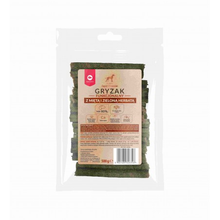 GRYZAK FUNKCJONALNY z miętą i zieloną herbatą to monoproteinowy przysmak, który pomaga utrzymać zęby oraz dziąsła w czystości i zdrowiu. Gryzak pomaga chronić zęby przed narastaniem kamienia nazębnego, a także dostarcza wapnia niezbędnego do budowy kości i zębów. Dodatek mięty i zielonej herbaty działa antyseptycznie, a także pomaga niwelować nieprzyjemny zapach z jamy ustnej. Dzięki zawartości tylko jednego rodzaju mięsa, przysmak jest polecany psom z alergiami na białko inne niż indycze. Bez dodatku cukru.