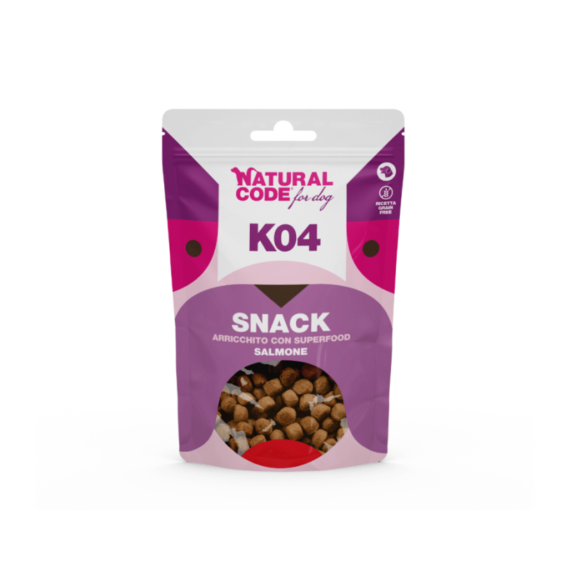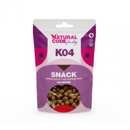 Natural Code Dog Snack Superfood K04 Łosoś to przysmaki ze starannie wyselekcjonowanego łososia – doskonałego źródło wysokiej jakości białka oraz kwasów Omega-3, które wspierają zdrowie skóry i sierści. Zostały wzbogacone o marchew dostarczającą cennych witamin i antyoksydantów oraz lekkostrawne ziemniaki będące alternatywą dla zbóż. Dodatek tymianku wspomaga układ odpornościowy i trawienie, dzięki swoim naturalnym właściwościom.