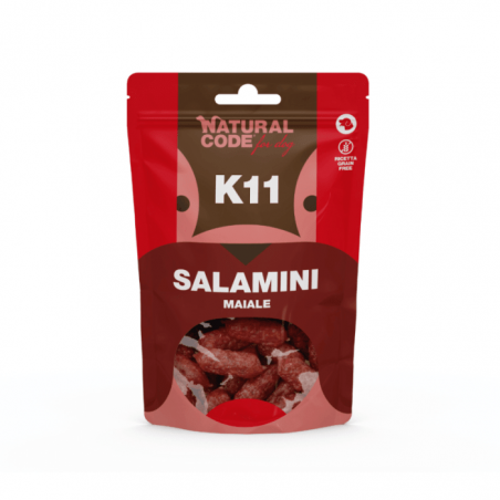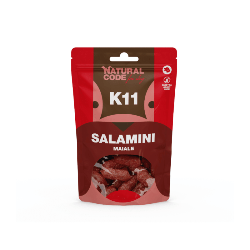 Natural Code Dog Snack Sausages K11 Wieprzowina to przysmak zawierający aż 92% mięsa i produktów pochodzenia zwierzęcego w tym 26% wieprzowiny, co czyni go bogatym źródłem wysokiej jakości łatwostrawnego białka.
