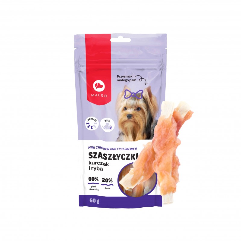Przysmak małego psa to linia dedykowana najmniejszym czworonogom. Odpowiedni rozmiar kawałków i wyjątkowy smak, sprawiają, że nawet najbardziej wybredne maluchy znajdą swoją ulubioną wersję. Szaszłyczki kurczak i ryba to smakowita przekąska w postaci piersi kaczej owiniętej na paluszku z dorsza. Takie połączenie przypadnie do gustu każdemu psu. Doskonały smak, odpowiednia konsystencja oraz zapach gwarantują psu radość z jedzenia. Szaszłyk jest idealną przekąską pomiędzy posiłkami, sprawdzi się również jako nagroda. Karma uzupełniająca dla psów.