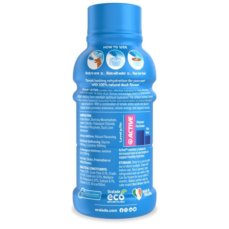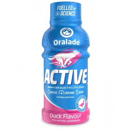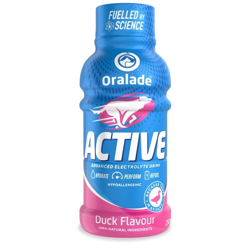 Oralade® ACTIVE zapewnia szybkie i skuteczne nawodnienie psa. Jego pyszne smaki zachęcają do picia pomagając im utrzymać optymalne nawodnienie! Unikalna formuła izotoniczna pomaga szybko uzupełnić niezbędne płyny i elektrolity, aby przywrócić naturalną równowagę organizmu. Dzięki połączeniu prostych aminokwasów i glukozy Oralade Active wspomaga wytrzymałość, uzupełnia energię i wspomaga regenerację.