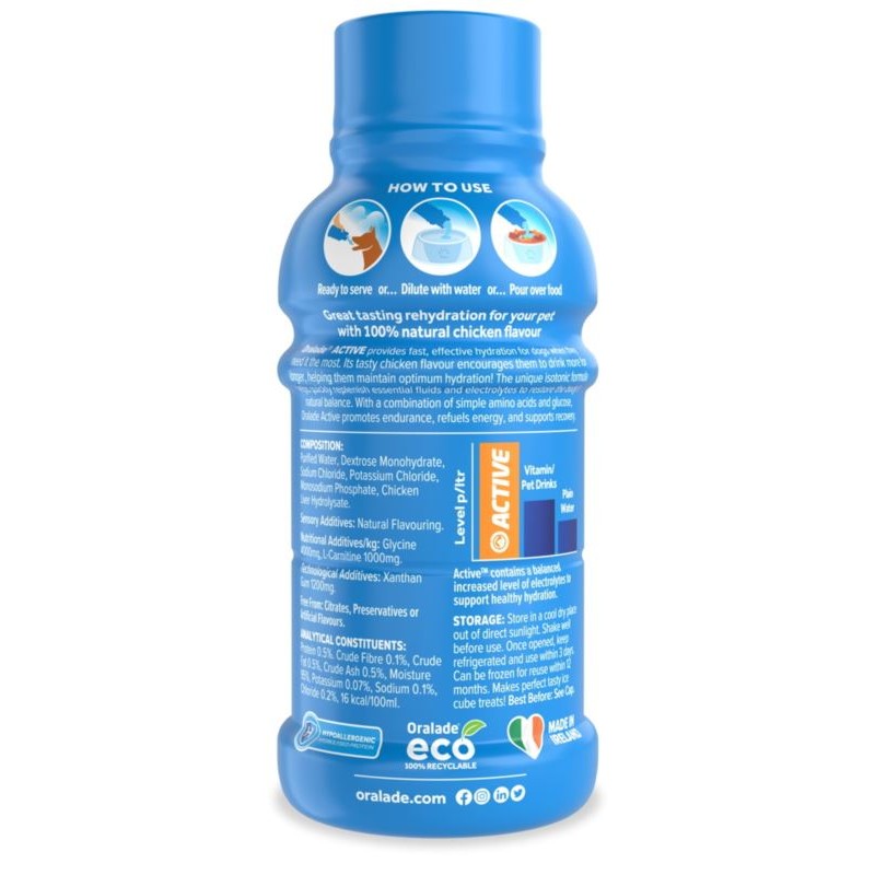 Oralade® ACTIVE zapewnia szybkie i skuteczne nawodnienie psa. Jego pyszne smaki zachęcają do picia pomagając im utrzymać optymalne nawodnienie! Unikalna formuła izotoniczna pomaga szybko uzupełnić niezbędne płyny i elektrolity, aby przywrócić naturalną równowagę organizmu. Dzięki połączeniu prostych aminokwasów i glukozy Oralade Active wspomaga wytrzymałość, uzupełnia energię i wspomaga regenerację.