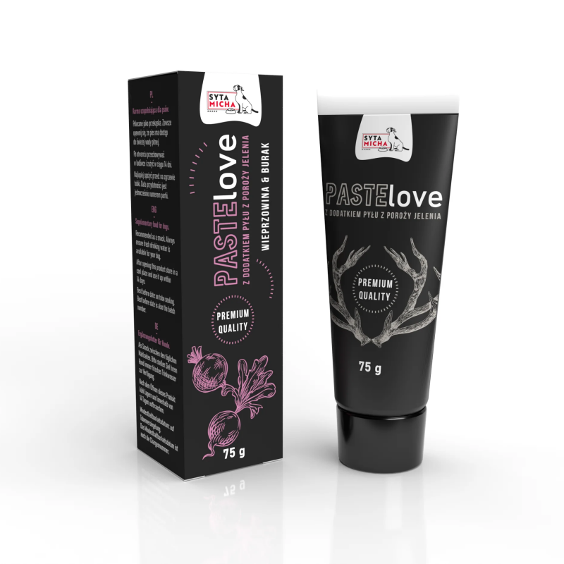 Syta Micha PasteLOVE Mięsna pasta Wieprzowina z burakiem to zdrowa przekąska dla psa, dająca 100% satysfakcji pupilom w każdym wieku bez względu na rasę.