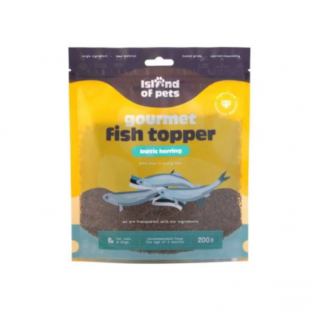 Delikatny topper rybny Island of Pets to suszone na powietrzu, całe płatki ryby z Bałtyku (śledź), bez zbędnych dodatków. Idealny jako urozmaicenie posiłku lub smakowity dodatek treningowy. Produkt powstaje w Polsce, z dbałością o naturalne wartości odżywcze i aromat, bez konserwantów, barwników i wypełniaczy.