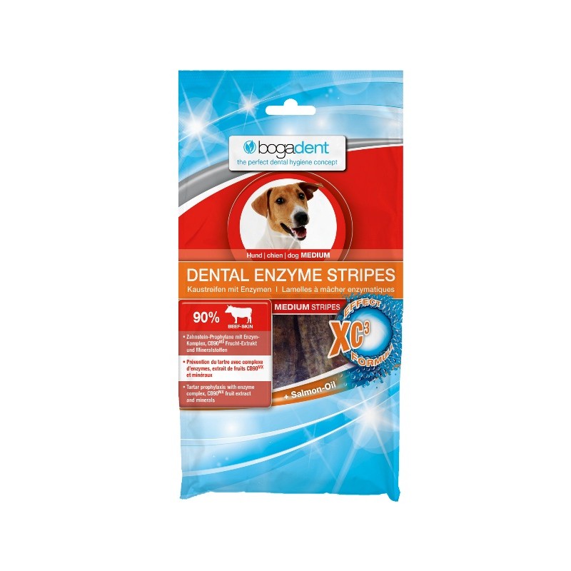 Bogadent® Dental Enzyme Stripes to idealne rozwiązanie, by połączyć pielęgnację zębów z przyjemnością gryzienia. Innowacyjna formuła XC3-Effect jest oparta na naturalnych enzymach ze skoncentrowanego białka serwatki i 2 substancjach czynnych (ekstrakcie z owoców CB90MX i minerałach). Chroni przed tworzeniem się płytki i kamienia nazębnego oraz może zapobiec podrażnieniom dziąseł. Wyjątkowo smaczna skóra wołowa DENTAL ENZYME STRIPES czyści dodatkowo zęby w trakcie gryzienia.