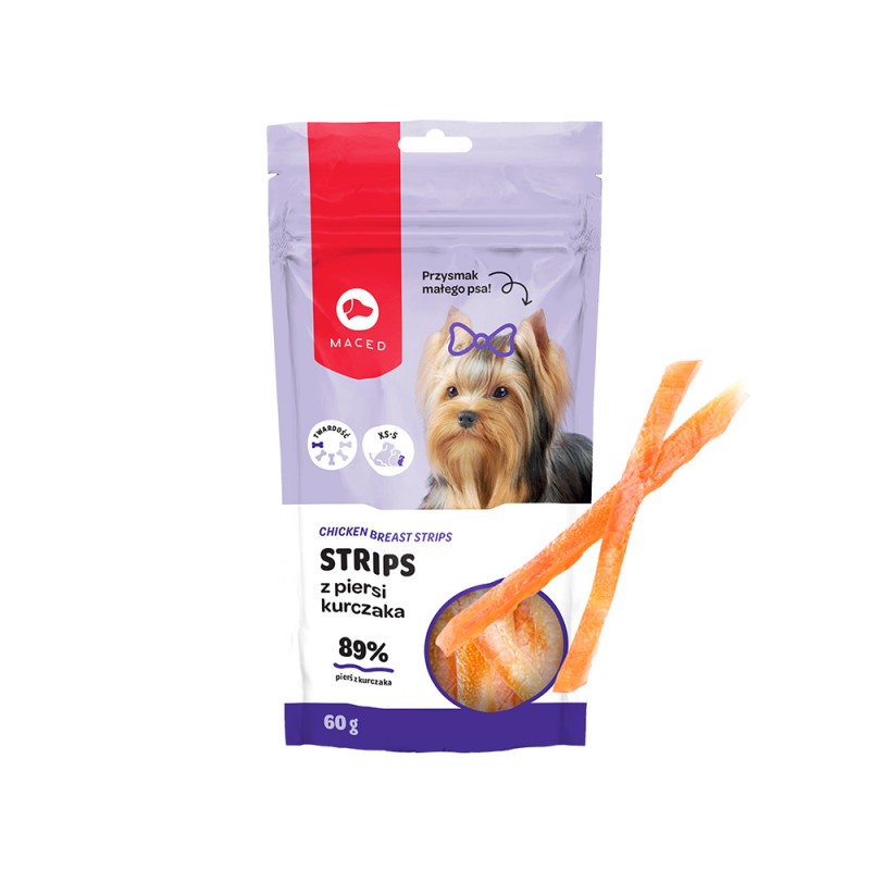 Maced miękkie paski z kaczki to smaczna przekąska dla psów. Filety z piersi kaczki Maced mają oryginalny kształt i aromatyczny zapach, co sprawia, że stanowią wyjątkową frajdę dla psiego podniebienia. W związku z niską zawartością tłuszczu przysmak będzie odpowiedni dla wszystkich łakomczuchów z tendencją do tycia.