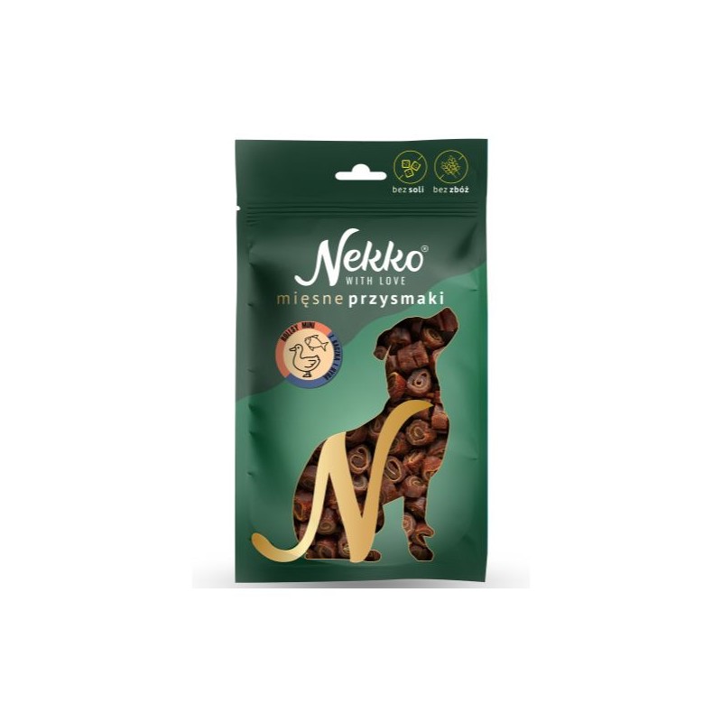 Mięso KACZKI jest bogate w witaminę A i E, RYBA zaś jest źródłem kwasów Omega 3. Przysmaki zaspokajają naturalną potrzebę gryzienia u psów, szczególnie polecane do nauki np. zostawania w domu i wyciszania emocji. Praktyczny kształt rollsów idealnie sprawdzi się również na trening na spacerze. Woreczek strunowy zapewnia długotrwałą świeżość przysmaków na długi czas.