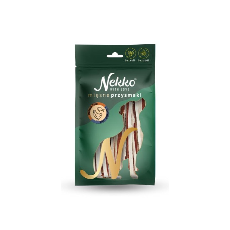 Mięso KURCZAKA jest źródłem cennego cynku i magnezu, RYBA zaś jest źródłem kwasów Omega 3. Przysmaki zaspokajają naturalną potrzebę gryzienia u psów, szczególnie polecane do nauki np. zostawania w domu i wyciszania emocji. Praktyczny kształt pasków idealnie sprawdzi się również na trening na spacerze. Woreczek strunowy zapewnia długotrwałą świeżość przysmaków na długi czas.