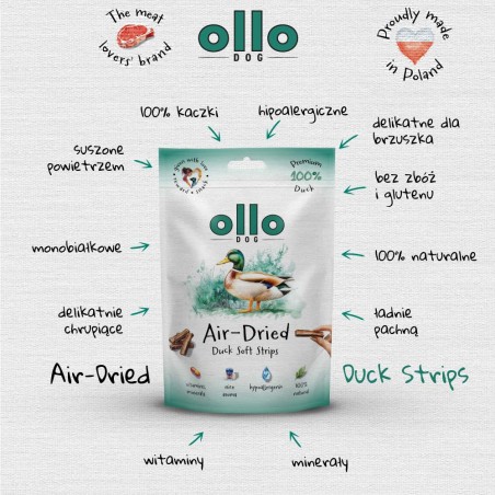 Ollo Air Dried Duck Strips to naturalne i lekkostrawne paski z kaczki, delikatnie suszone powietrzem, aby zachować pełnię smaku i wartości odżywczych. To wyjątkowy przysmak, który wspiera zdrowie Twojego pupila i zaspokaja jego potrzeby żywieniowe.