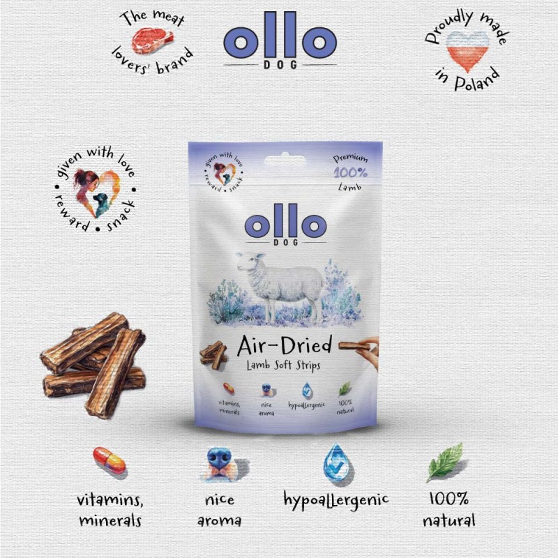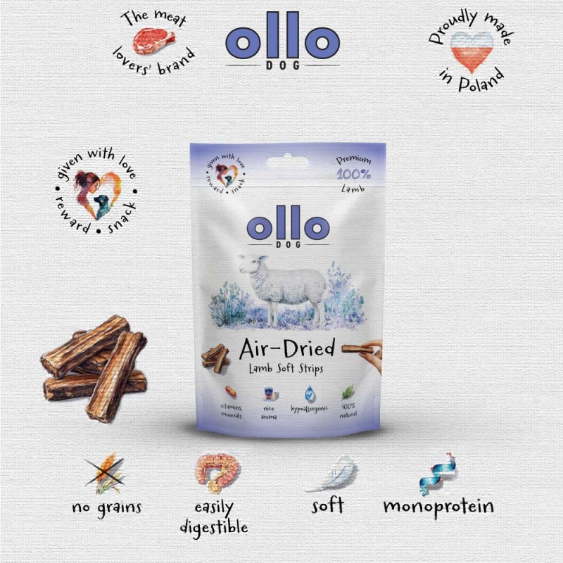 Ollo Air Dried Lamb Strips to naturalne i lekkostrawne paski z jagnięciny, delikatnie suszone powietrzem, aby zachować pełnię smaku i wartości odżywczych. To wyjątkowy przysmak, który wspiera zdrowie Twojego pupila i zaspokaja jego potrzeby żywieniowe.