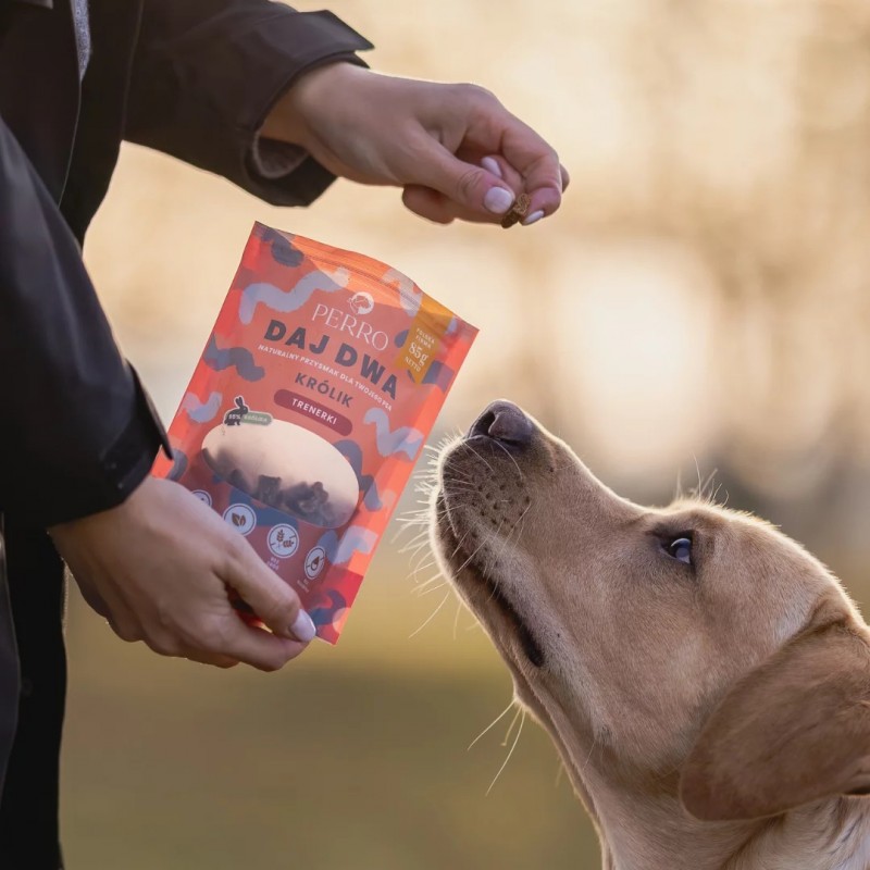 PERRO Daj Dwa to naturalne, suszone przysmaki (bez gliceryny!), które bez wątpienia podkręcą entuzjazm treningowy czworonożnych przyjaciół.