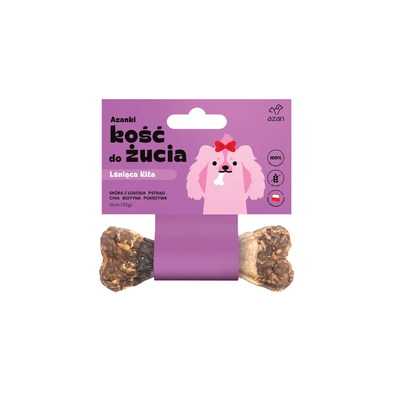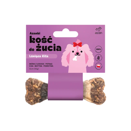Azanki Kość do żucia LŚNIĄCA KITA ze skórą z łososia, biotyną i pokrzywą to wyśmienity przysmak dla dorosłych psów małych oraz średnich ras, zaspokajający ich naturalną potrzebę gryzienia i żucia. Kość stanowi istne bogactwo dobroczynnych dla skóry i sierści kwasów omega-3, dzięki skórze z łososia, pstrągowi oraz nasionom chia. Dodatek biotyny i pokrzywy łagodzi skórę, wzmacnia pazury i poprawia jakość sierści psa. Kości nie zawierają ostrych i kruchych elementów, stanowiąc bezpieczniejszą alternatywę dla rozmaitych gryzaków.