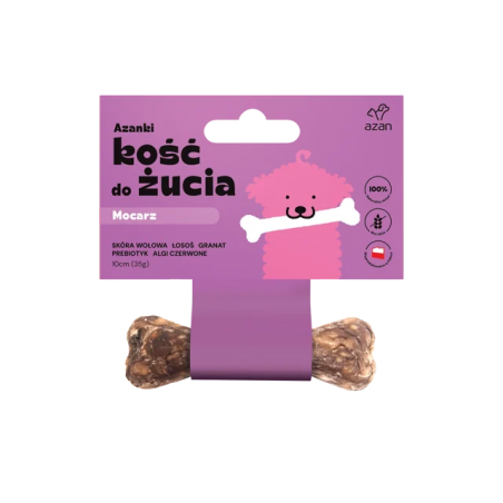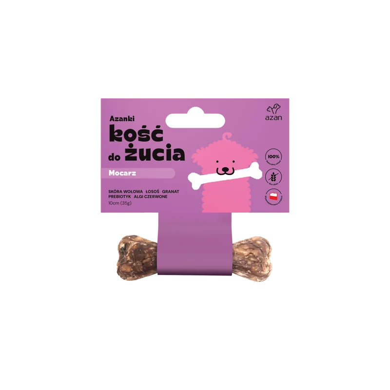 Azanki Kość do żucia MOCARZ z łososiem, granatem i prebiotykiem to wyśmienity przysmak dla szczeniąt małych oraz średnich ras, zaspokajający ich naturalną potrzebę gryzienia i żucia. Kompozycja składników ukierunkowana jest na wspieranie młodego organizmu szczeniaka, pod kątem rozwoju układu pokarmowego, uzupełnienia niezbędnych składników odżywczych oraz wspierania odporności: bogata w kolagen skóra wołowa, łosoś będący skarbnicą kwasów omega-3, wspierający odporność granat i prebiotyk Dolvit, a także dawka minerałów z alg czerwonych. Kości nie zawierają ostrych i kruchych elementów, stanowiąc bezpieczniejszą alternatywę dla rozmaitych gryzaków.