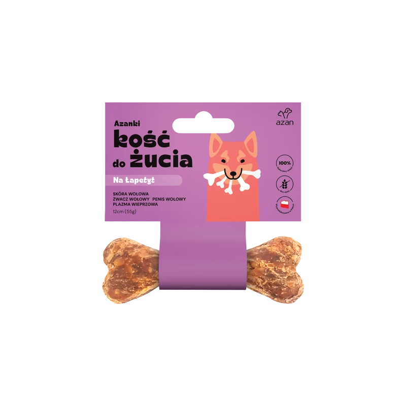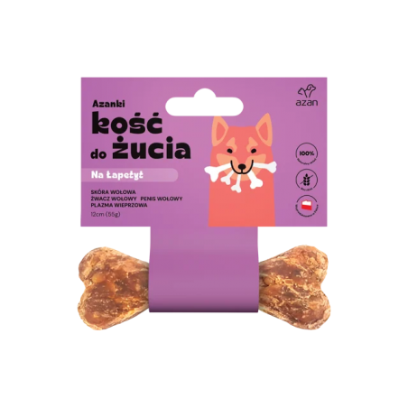 Azanki Kość do żucia NA ŁAPETYT ze żwaczem i penisem wołowym to wyśmienity przysmak dla dorosłych psów małych oraz średnich ras, zaspokajający ich naturalną potrzebę gryzienia i żucia. Połączenie wysoce aromatycznych, wołowych składników: żwacza oraz penisa, zawiniętych w skórę, stanowi niezwykle kuszącą, naturalną przekąskę, nęcącą swoim atrakcyjnym zapachem i smakiem nawet psie niejadki oraz szczególnie wybredne osobniki! Kości nie zawierają ostrych i kruchych elementów, stanowiąc bezpieczniejszą alternatywę dla rozmaitych gryzaków.