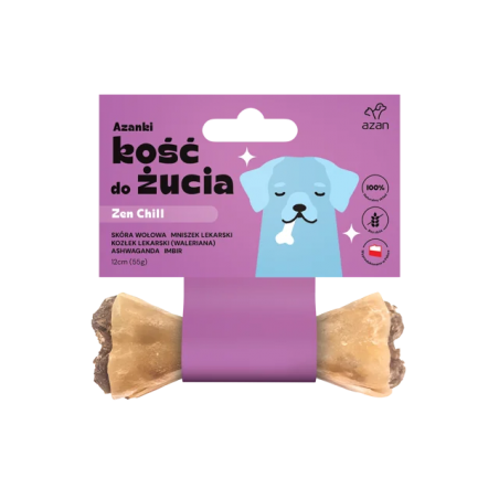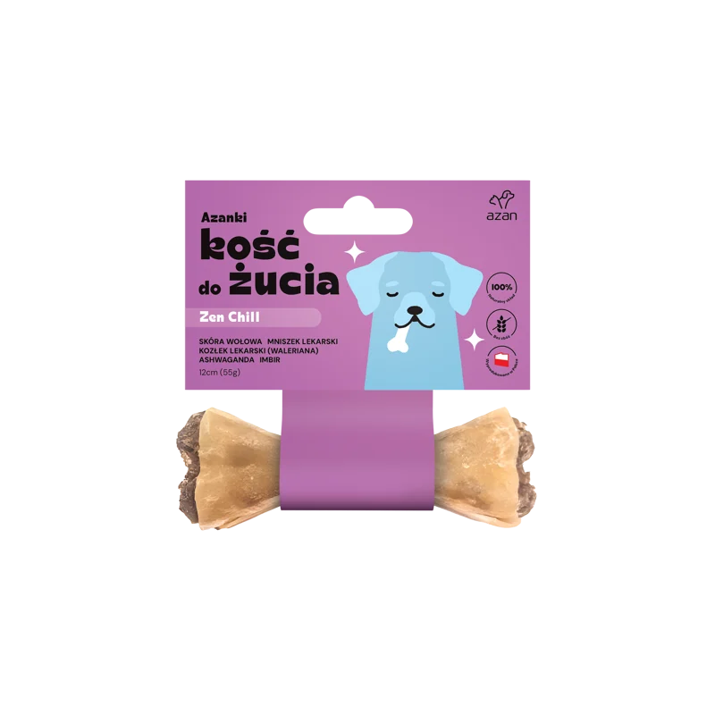 Azanki Kość do żucia ZEN CHILL z mniszkiem, walerianą i ashwagandą to wyśmienity przysmak dla dorosłych psów małych oraz średnich ras, zaspokajający ich naturalną potrzebę gryzienia i żucia. Kość wzbogacona jest mieszanką ziołową o działaniu uspokajającym, wspierającym układ trawienny i odpornościowy. Kompleks ziół: mniszka lekarskiego, waleriany, ashwagandy i imbiru to znakomite połączenie składników wspomagających osiągnięcie stanu odprężenia i pełnej, psiej harmonii. Kości nie zawierają ostrych i kruchych elementów, stanowiąc bezpieczniejszą alternatywę dla rozmaitych gryzaków.